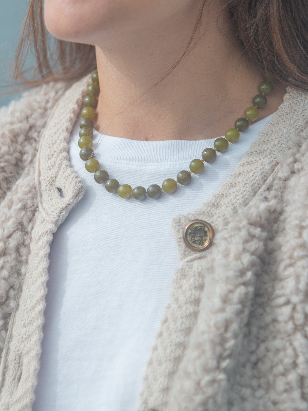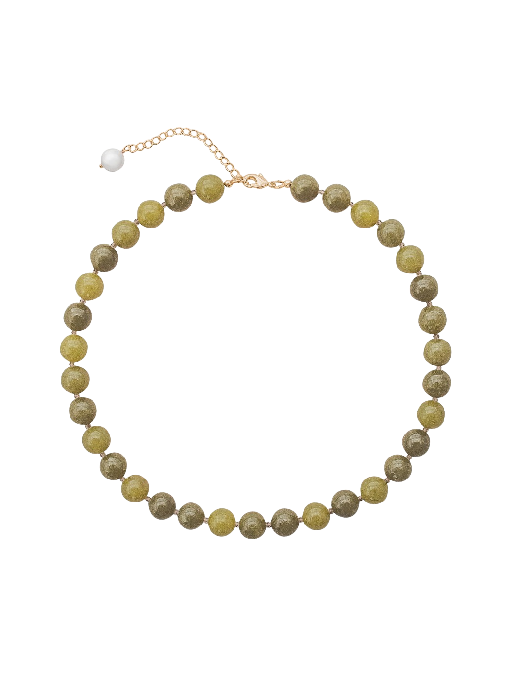 - Olive jade and faceted smoky quartz gemstones, freshwater pearl charm