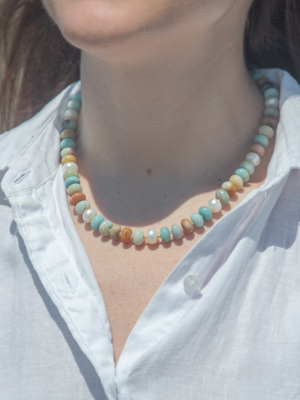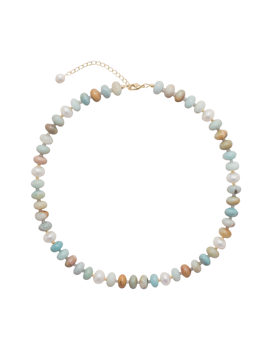 - Amazonite and faceted aquamarine gemstones, freshwater pearls