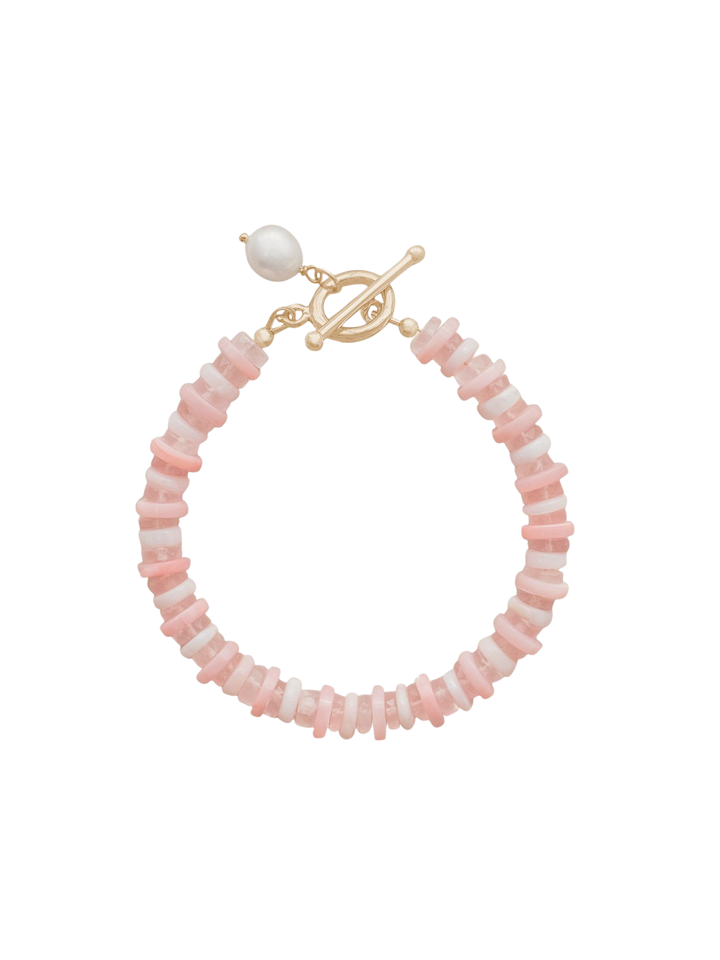 - Pink dyed mother of pearl, pink Peruvian opal and rose quartz gemstones, freshwater