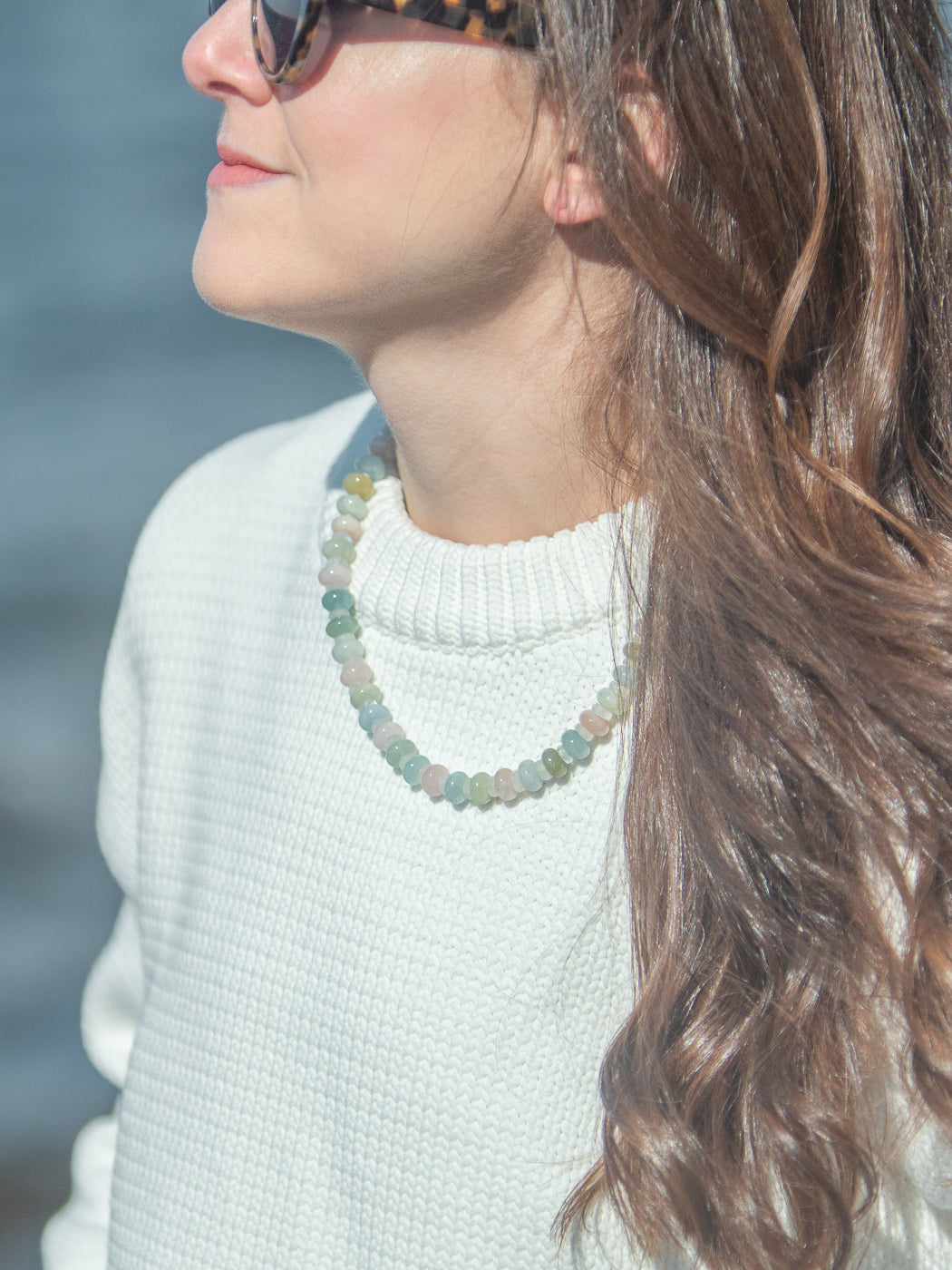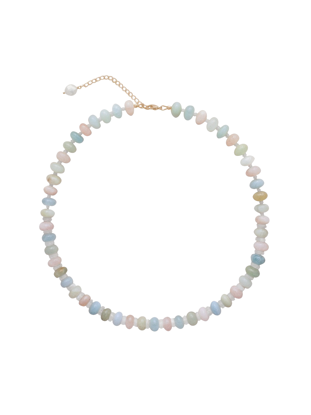 - Morganite and moonstone gemstones, freshwater pearl charm
